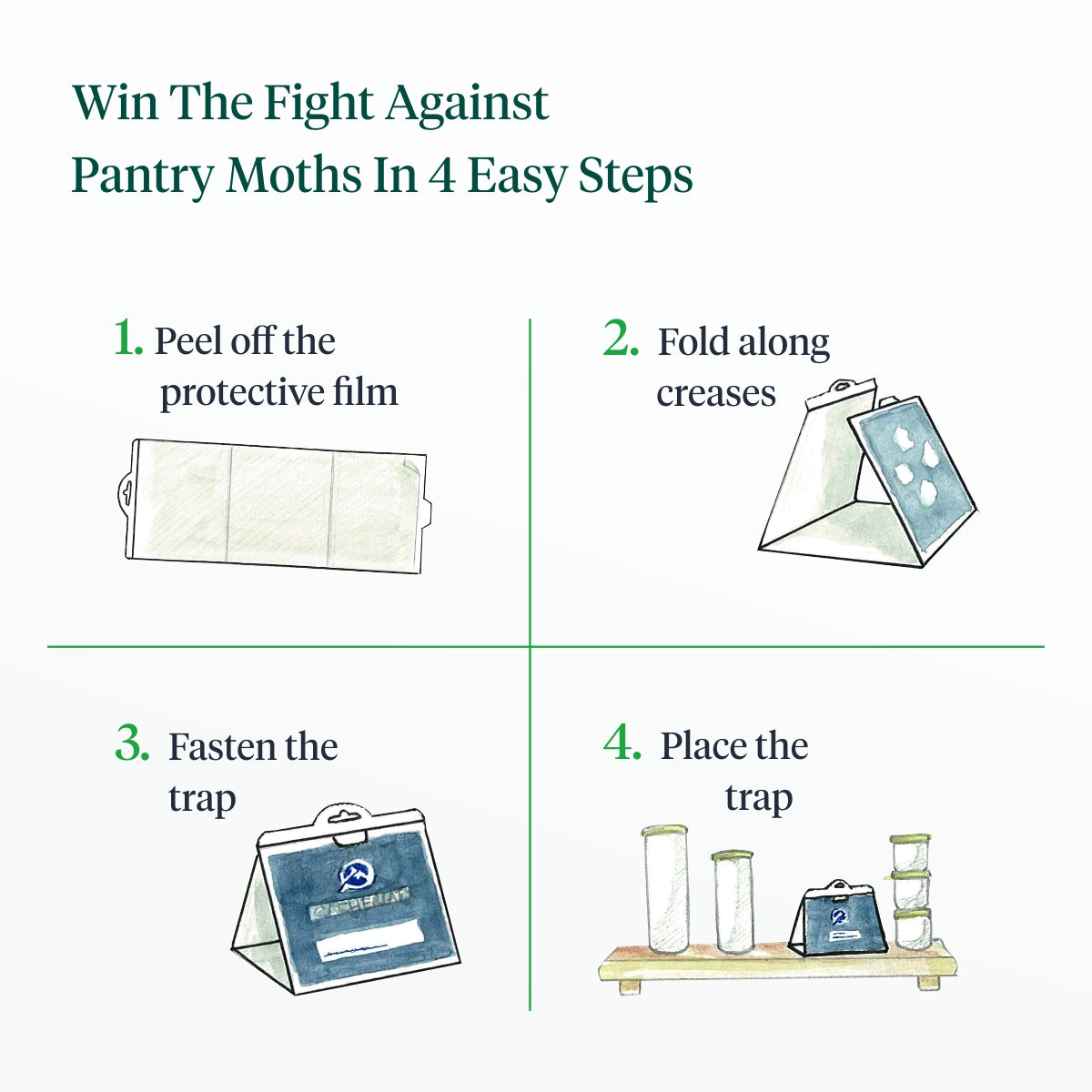 We recommend placing 6 traps (1 pack) for a standard-sized kitchen. If you happen to have a more oversized kitchen or a strong moth infestation, we recommend putting 9 to 12 traps (2 packs of Pantry Moth Traps).